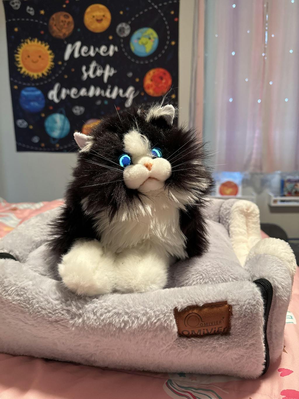 The cat’s voice is impressively realistic, especially the gentle purring, which adds a comforting touch. Its fur is incredibly soft, making it feel even more lifelike. My daughter adores cuddling it! However, we did notice that the cat sheds a little, which is surprisingly similar to a real cat.