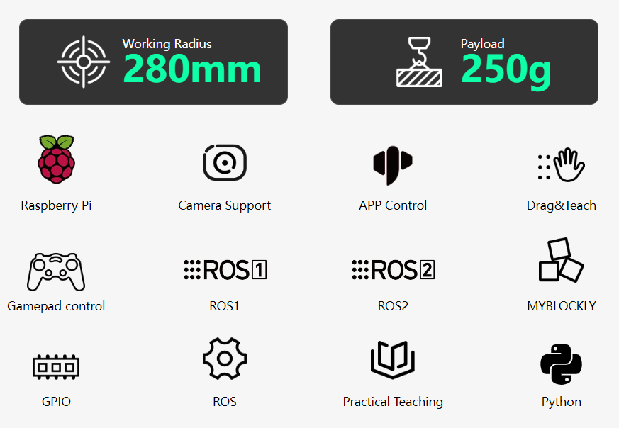 Using Raspberry Pi microprocessor and Ubuntu Mate 20.04 operating system, myCobot 280 Pi can be used by connecting monitor, keyboard and mouse without PC master control. It is the first choice for building robot arm programming education, control logic development, robot application and ROS simulation experiment class. To help you quickly start the learning and application of six axis robotic arm.