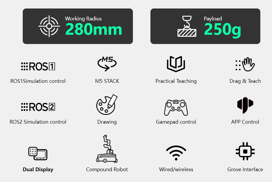 Designed for research and makers, the myCobot 280 series robot arms offer a variety of control methods. They also boast reliable mobile transport and precise placement capabilities, making them ideal for various tasks.